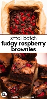 When chocolate cravings meet a love for tart fruit, these small batch chocolate raspberry brownies hit both notes. Made with cocoa powder, melted chocolate, and swirls of fresh raspberries, the no-mixer brownies bake up extra-fudgy in just over 40 minutes with the perfect shiny, crinkly tops.