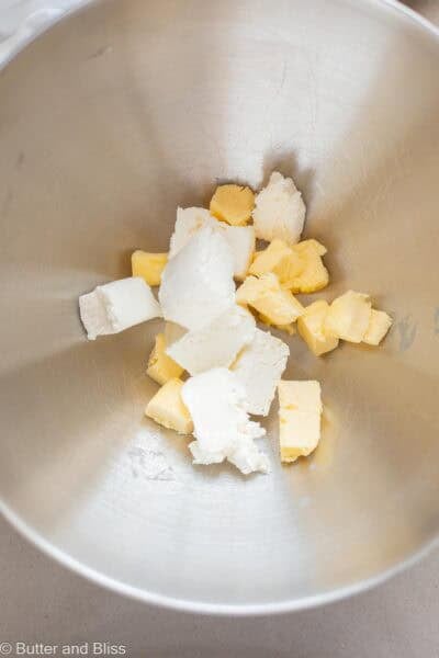 Add the cream cheese and butter to your mixing bowl. I like to cut them into cubes because it helps them reach room temperature faster and blend more evenly.