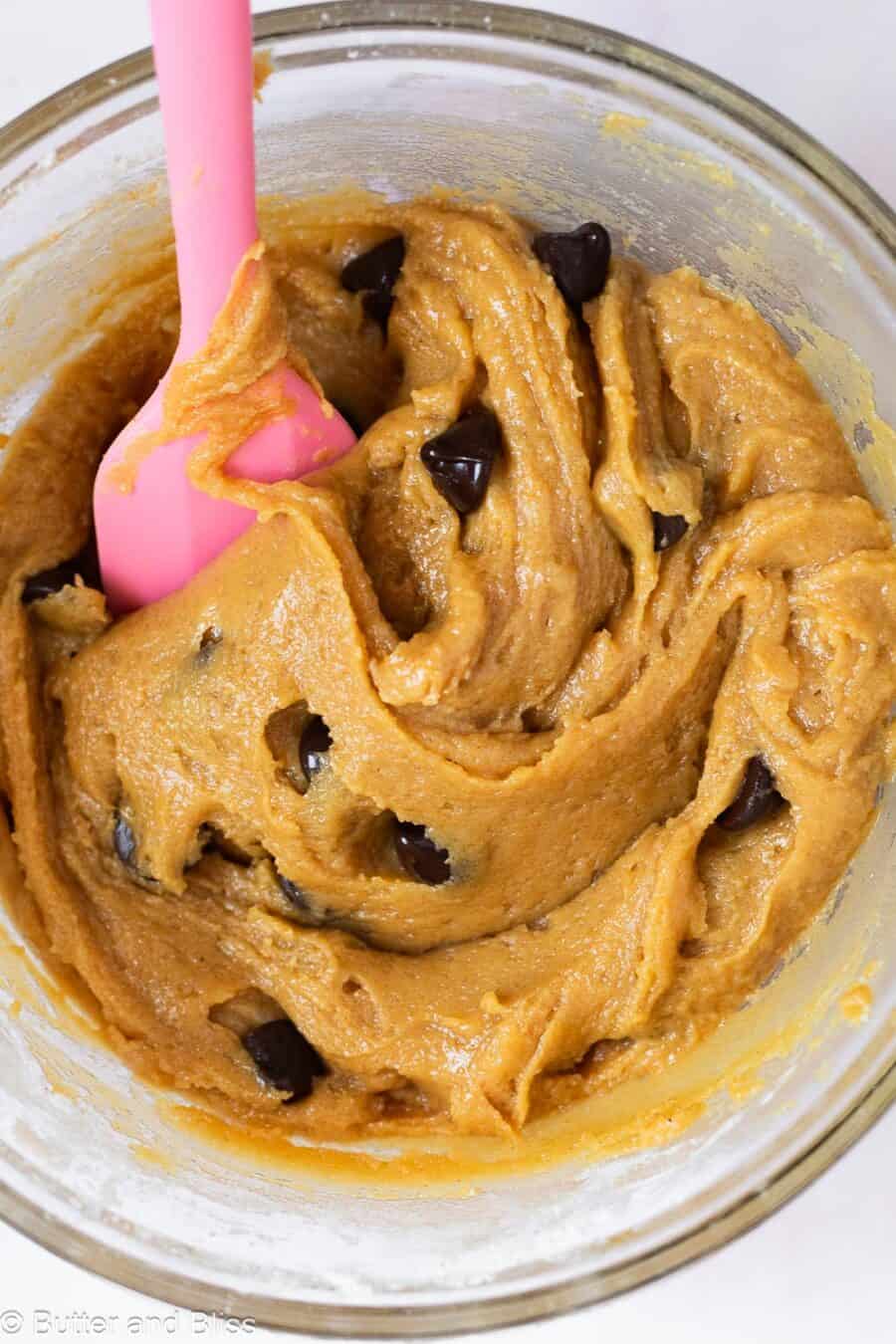 After you add the dry ingredients, this is also where the chocolate chips come into play. You’ll want to switch to a spatula to fold them into the batter. This keeps their shape and lets you see how they are distributed, so you have a chip in every bite.