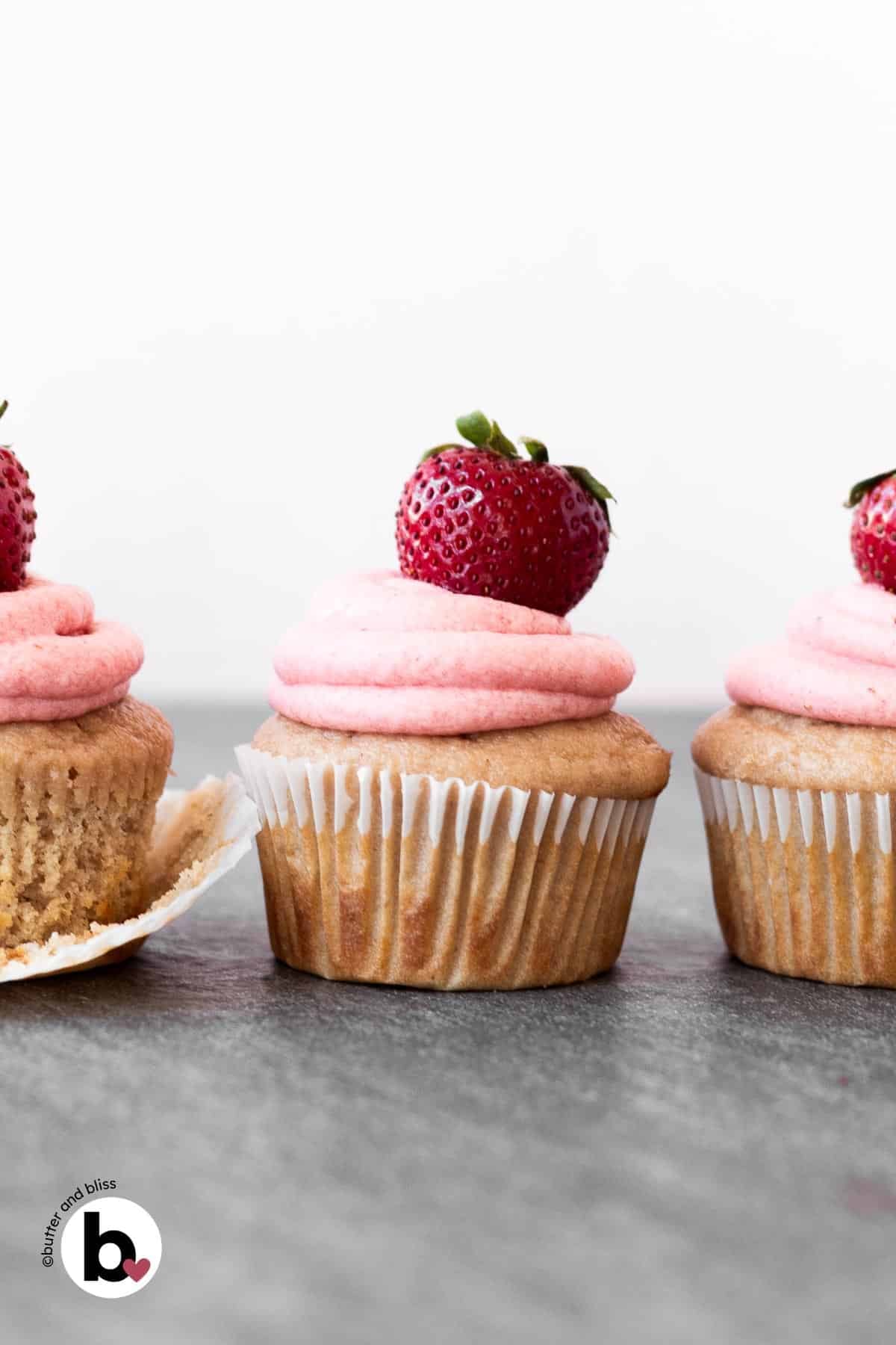 These pretty cupcakes are a favorite in my house. If it’s a special occasion, or just a random Tuesday, they typically make an appearance when we want to indulge in something a little strawberry!