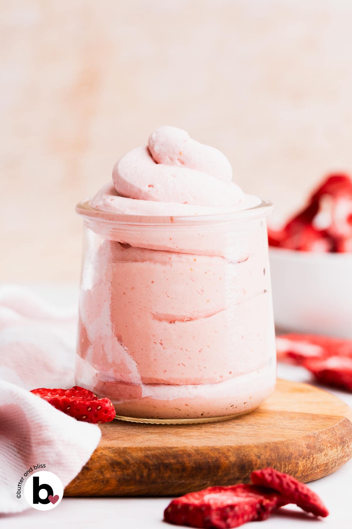 This strawberry whipped cream is made with only 3 ingredients, and it holds its shape for hours. Freeze-dried strawberries deliver pure strawberry flavor and a natural pink hue, and marshmallow cream keeps it fluffy and stable without gelatin. Use it as a frosting on cakes or cupcakes, dollop it on pies, or layer it in parfaits.